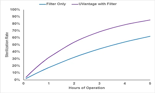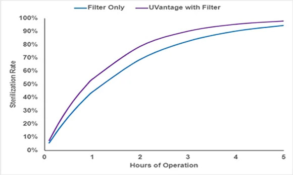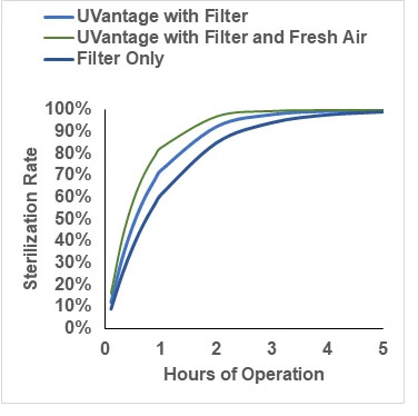 With 400CFM (approximating fan-only mode), UVantage™ air treatment system provides approximately 50% reduction in active airborne pathogens within 2 hours of operation with a Merv 4 filter.